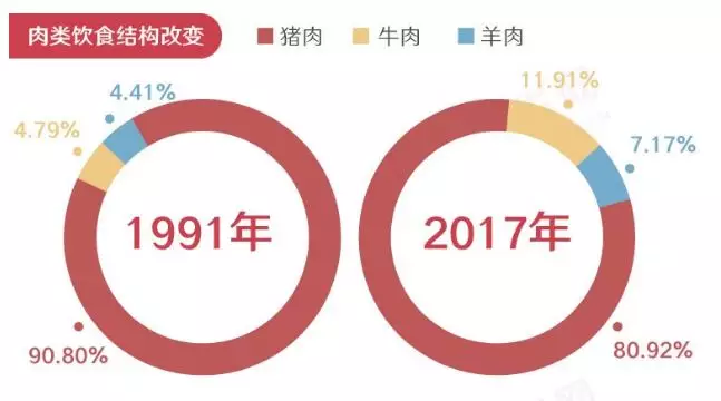 然而,近年來,中國消費者對豬肉的熱情似乎在減退。根據(jù)新華網(wǎng)最新發(fā)布的數(shù)據(jù)顯示,在由豬、牛、羊三類構成的肉類市場中,豬肉的消費量占比已經(jīng)從1991年的90.8%下降到2017年的80.9%。而且,這一數(shù)據(jù)還將繼續(xù)下降。此消彼長之下,牛肉的消費量有了不少的提升。