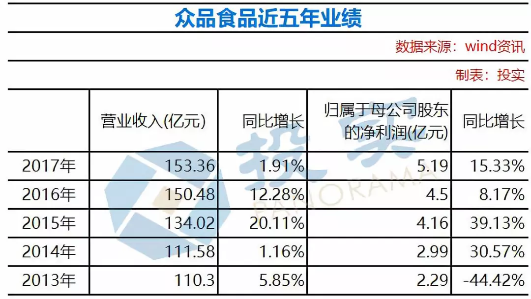 2017年,眾品食品實(shí)現(xiàn)營業(yè)收入153.36億元,同比增長1.91%,歸屬于母公司股東的凈利潤5.19億元,毛利率9.44%。