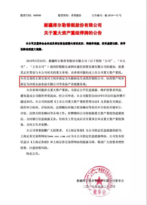 來源: 冷凍食品網(wǎng) 發(fā)布者:編輯5月23日晚,新疆庫爾勒香梨股份有限公司(簡稱“香梨股份”)公告稱因籌劃收購事項(xiàng)臨時(shí)停牌,收購標(biāo)的初步確定為河南眾品食品有限公司(以下簡稱“眾品食品”)。