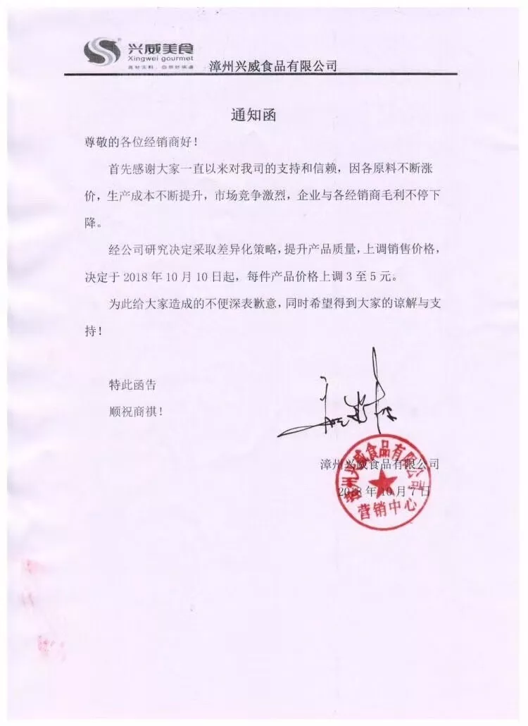 就在國(guó)慶假期的最后一天,10月7日,漳州興威食品有限公司(簡(jiǎn)稱(chēng)“興威食品”)也發(fā)出了類(lèi)似的通知函:決定于10月10日起,每件產(chǎn)品價(jià)格上調(diào)3至5元。
