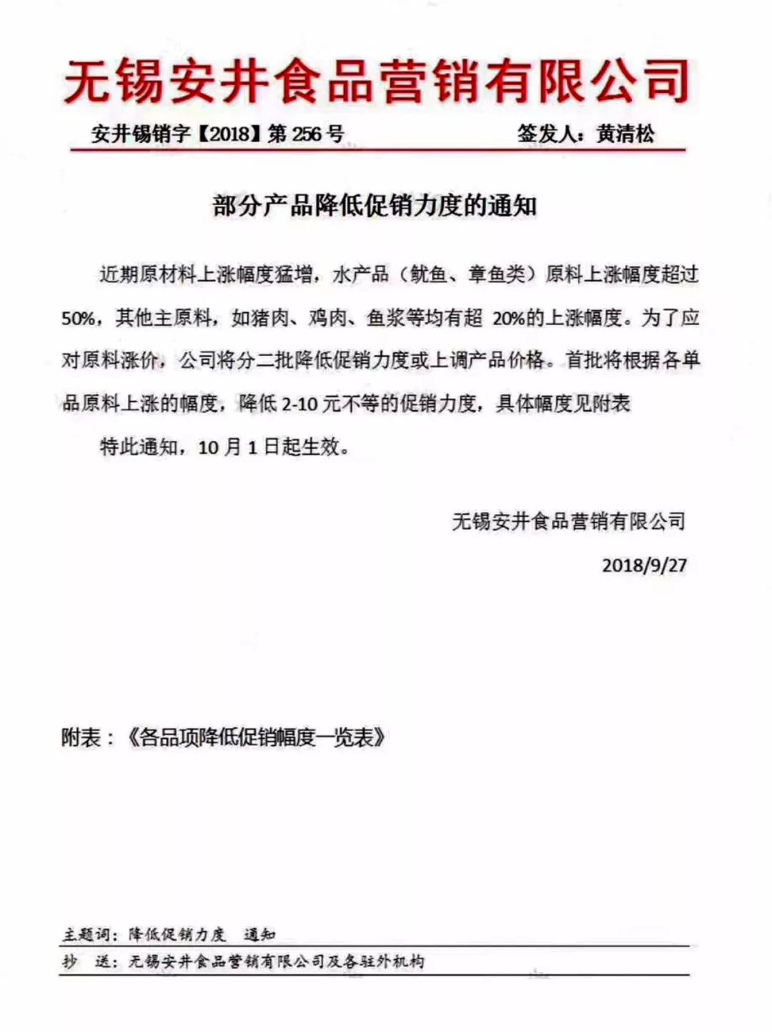 9月27日,無(wú)錫安井食品營(yíng)銷(xiāo)有限公司(簡(jiǎn)稱(chēng)“安井食品”)發(fā)出的“部分產(chǎn)品降低促銷(xiāo)力度的通知”,在朋友圈廣為傳播。