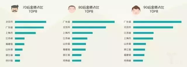 廣東、北京、上海消費(fèi)貢獻(xiàn)分列全國前三;北京70后的消費(fèi)貢獻(xiàn)為全國同齡消費(fèi)規(guī)模冠軍;廣東80、90后位列全國同齡規(guī)模冠軍。