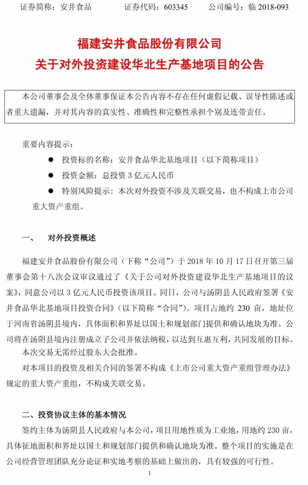 10月17日,安井食品召開第三屆董事會(huì)第十八次會(huì)議,審議通過(guò)了《關(guān)于公司對(duì)外投資建設(shè)華北生產(chǎn)基地項(xiàng)目的議案》,同意公司以3億元人民幣投資該項(xiàng)目。同日,公司與湯陰縣人民政府簽署《安井食品華北基地項(xiàng)目投資合同》。