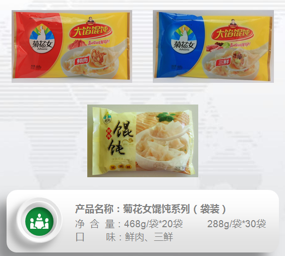 “菊花女”海鮮餃子、餛飩由品牌創(chuàng)始人王艷紅女士歷經(jīng)十余年潛心研制,以鮮活海鮮為主料,配以各種無公害蔬菜及20余種原料秘制而成,口感鮮美、營(yíng)養(yǎng)豐富。產(chǎn)品曾榮獲“中國(guó)名宴”、“金廚獎(jiǎng)”、“東北名點(diǎn)”、“遼寧家常名點(diǎn)”等榮譽(yù)稱號(hào)。2011年,公司被葫蘆島市質(zhì)量監(jiān)督局授予“葫蘆島名牌產(chǎn)品”,2012年被授予“遼寧省著名商標(biāo)”、市級(jí)農(nóng)業(yè)產(chǎn)業(yè)化重點(diǎn)龍頭企業(yè)。